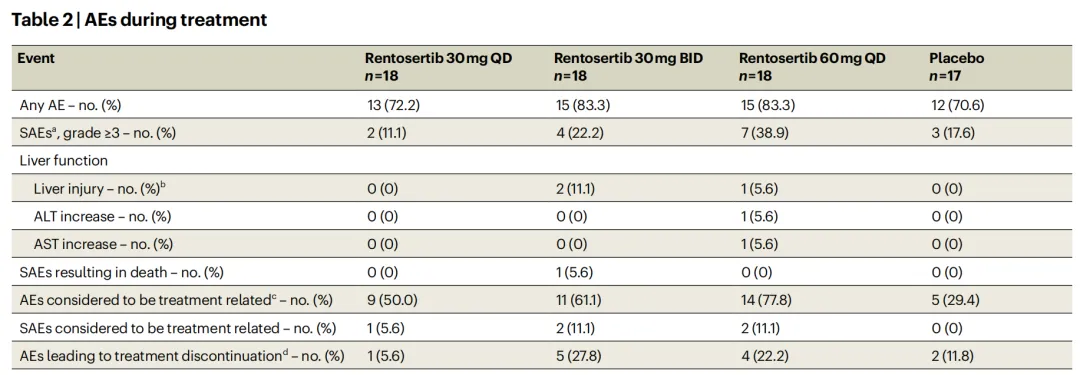 再聚焦导致治疗中止的不良事件,54名接受Rentosertib治疗患者中有10名(18.5%),17例接受安慰剂治疗患者中有2名(11.8%)。