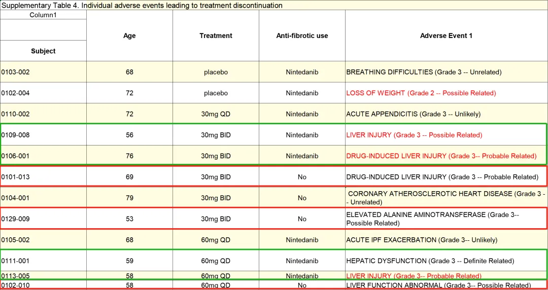 我们再仔细翻看Rentosertib在IIa期的一些治疗相关的不良反应事件,不可避免的有一些担忧,展示出来以供大家理性探讨。