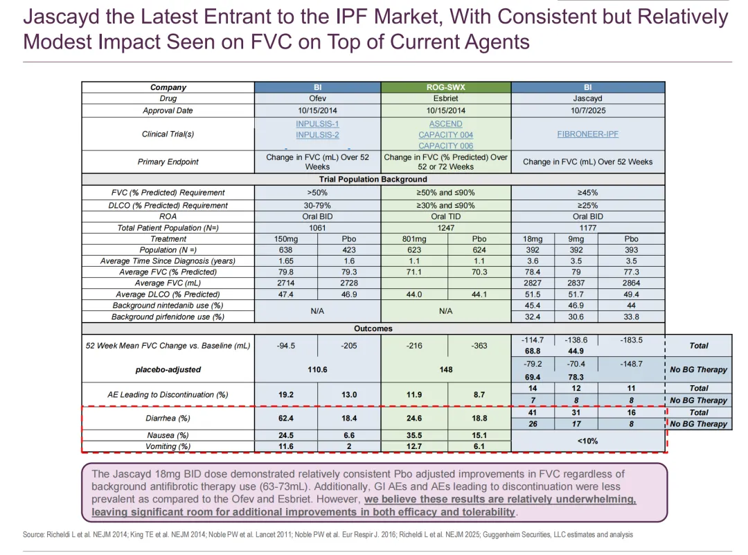 值得注意是,Jascayd三期临床的患者基线:77.7%的患者接受背景抗纤维化治疗(45.5%使用尼达尼布,32.3%使用吡非尼酮),这具备很强的说服力。