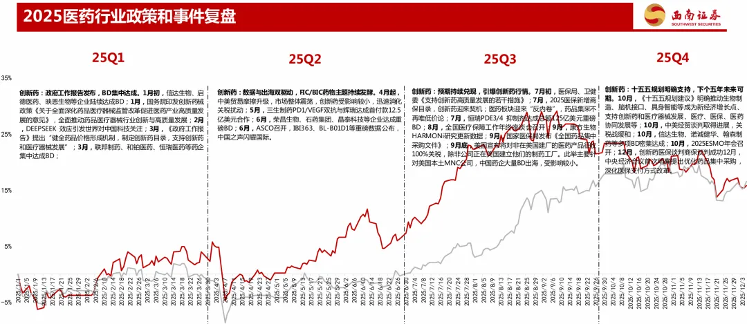 年初,受Deepseek等人工智能对科技股的带动,板块温和上涨;5月份受三生制药和辉瑞的大额BD交易影响,创新药的做多热情被引爆,而后多家公司频繁的BD交易、优秀临床数据的读出等,刺激板块持续强劲上涨,9月初板块指数达到今年的高点。