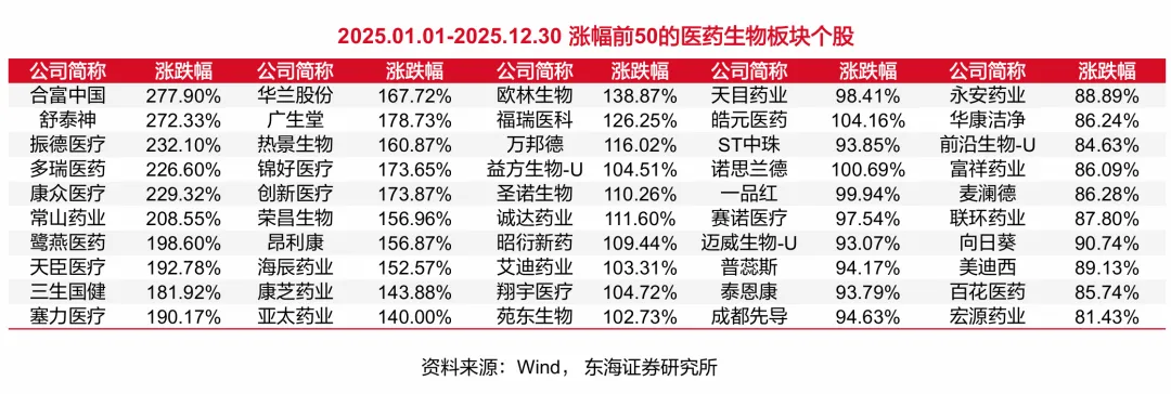 但仍有不少企业实现了股价翻倍。具体来看,根据东海证券研究所,2025年医药生物板块涨幅前50个股如下: