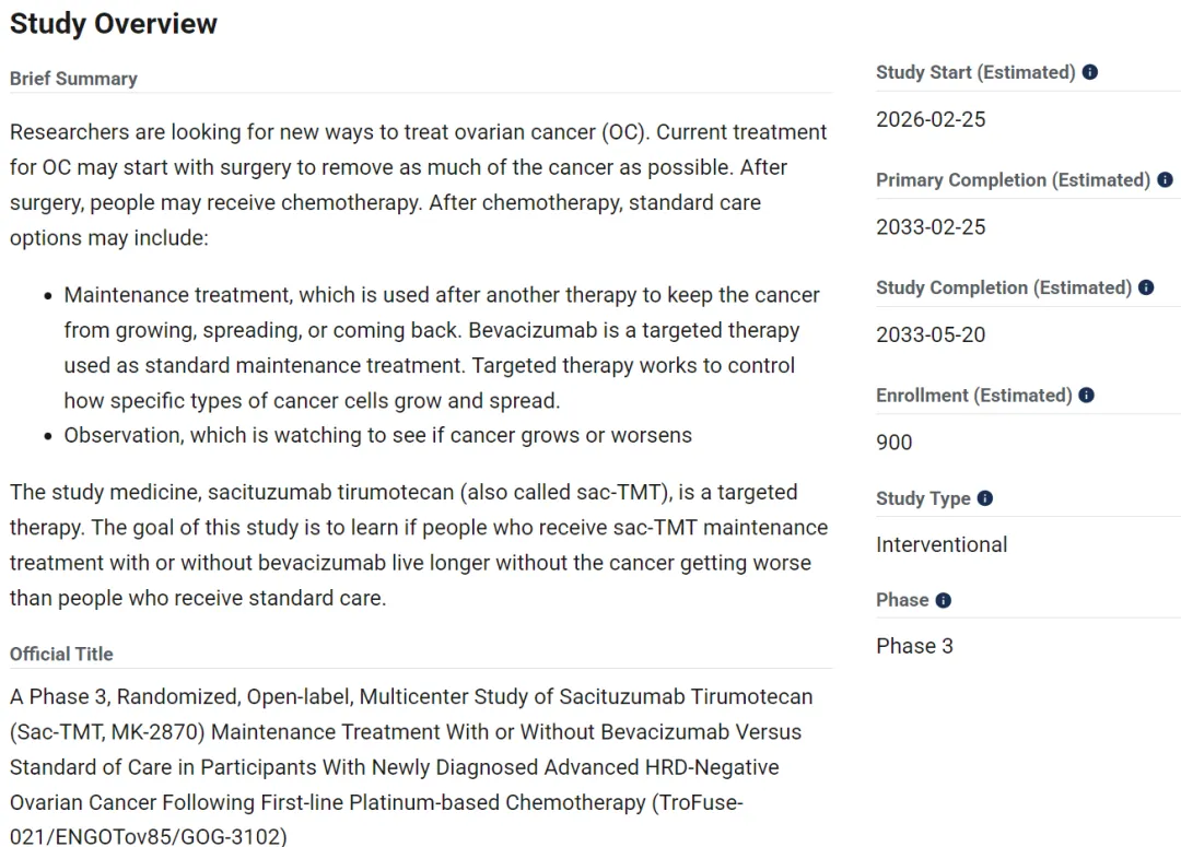 2026年1月6日,默沙东在Clinicaltrials.gov网站上注册了Trop2 ADC新药芦康沙妥珠单抗(MK-2870、SKB264)联合或部联合贝伐珠单抗治疗一线铂类化疗治疗后进展的HRD-卵巢癌的三期临床试验,这也是默沙东围绕芦康沙妥珠单抗开展的第16项全球三期临床试验。