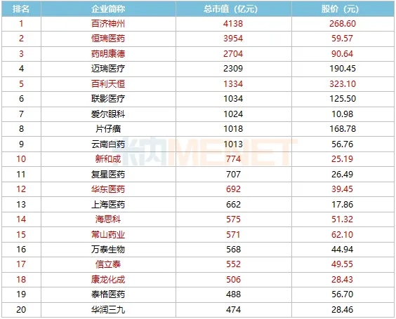 TOP20出炉!百济神州狂飙1900亿“登顶”,海思科、信立泰上榜