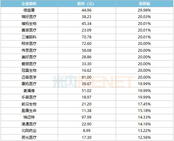 2026年首个交易日医药股股价涨幅TOP20