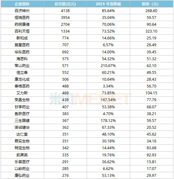 2025年市值涨幅超100%的医药股