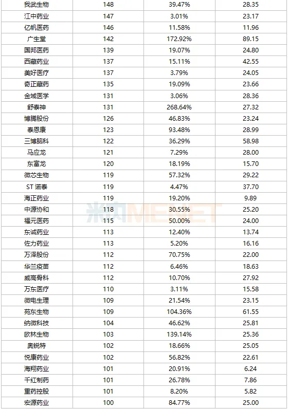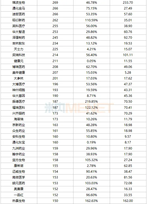 此外,百花医药、联环药业、信立泰等超60只涨幅超过50%,我武生物、达仁堂、兴齐眼药等超50只涨幅超过30%。