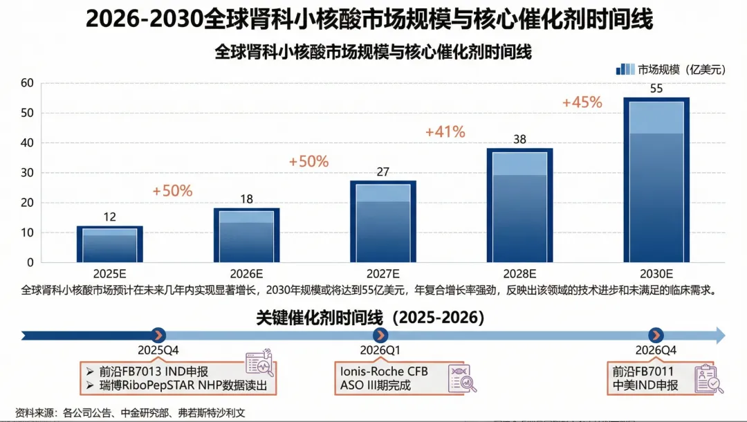 为何有如此判断?再生元每4周注射一次的靶向C5补体Cemdisiran将在2026年递交治疗全身重症肌无力(gME)的BLA,在成为首个C5补体的小核酸药物的同时,在gME展现的疗效和安全性有望延展至IgA肾病和阵发性睡眠性血红蛋白尿(PNH);其次,2026年上半年Ionis/罗氏的CFB ASO管线Sefaxersen有望读出IgA肾病的三期数据,冲击肾病的第一个小核酸重磅炸弹。