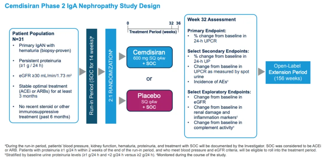 同样,Cemdisiran在IgA肾病领域的II期临床展现的潜力不俗(不过在IgA肾病中采取了更高强度的治疗,每4周注射一次600mg),入组了31名进行32周的治疗,主要终点是24h-UPCR改善。