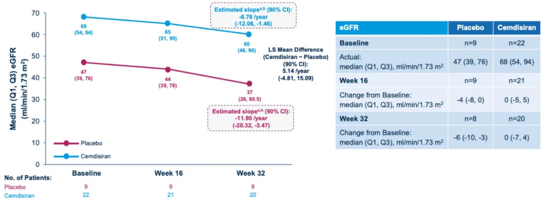 m⁻²;两组LS均值差5.14/年,这接受提示接受Cemdisiran治疗的患者肾功能下降趋势更缓但仍需进一步验证。