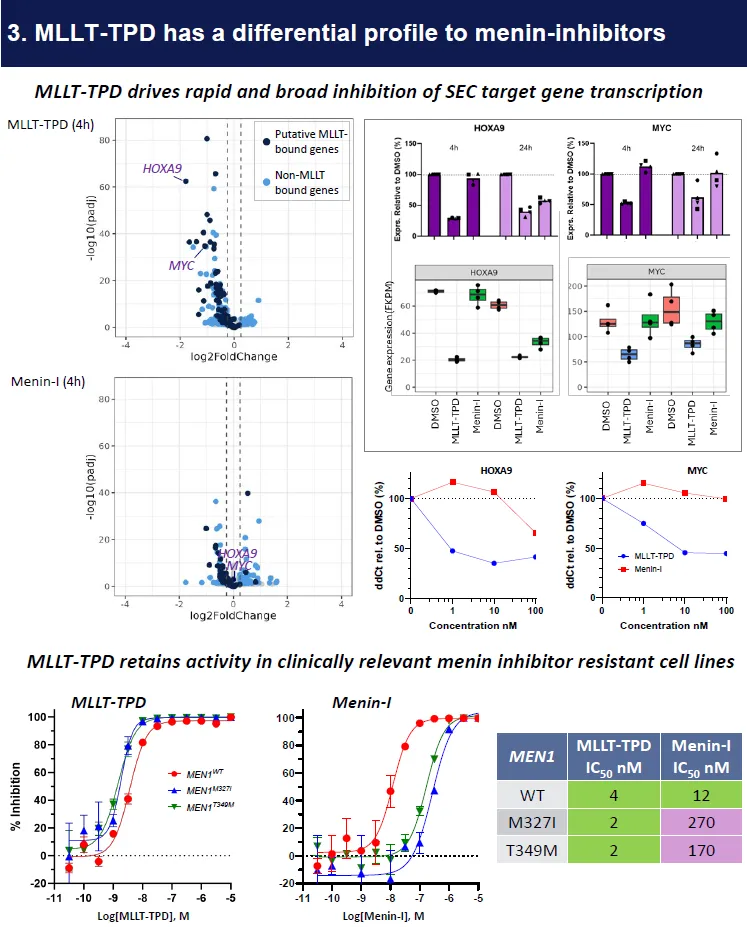Blue筛选的MLLT1/3降解剂与Menin抑制剂展现差异化的profile,可以更快速、更广泛地抑制SEC靶点济因转录,对于menin抑制剂耐药的细胞系仍然保留了抑制活性。