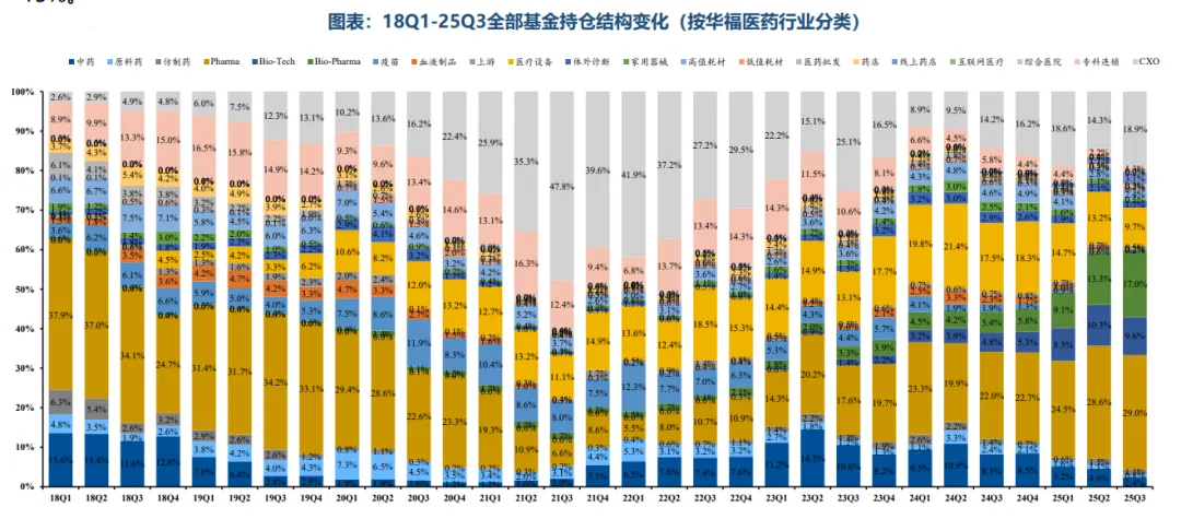 也是因为整个大健康其他板块的比较性优势,叠加上整个2025年板块无论从想象力还是业绩上都缺一些令人耳目一新的东西,过去半年里器械板块的资金配置比例降到了15%(对比22年24.5%)的历史低位。要知道,这还是在有联影和迈瑞两大权重股的前提下。