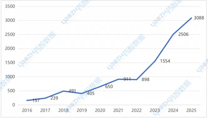 在市批文中,2016 - 2025年,批准上市药品品种数量从157个增长至3088个,整体呈上升趋势,2023年后增速显著加快。呈现“前期缓增波动、中期稳步回升、后期爆发式增长”的特征,反映医药行业在政策、技术、市场等多重因素推动下,审批效率与研发活力持续提升,尤其是2023年以后进入高速发展阶段。
