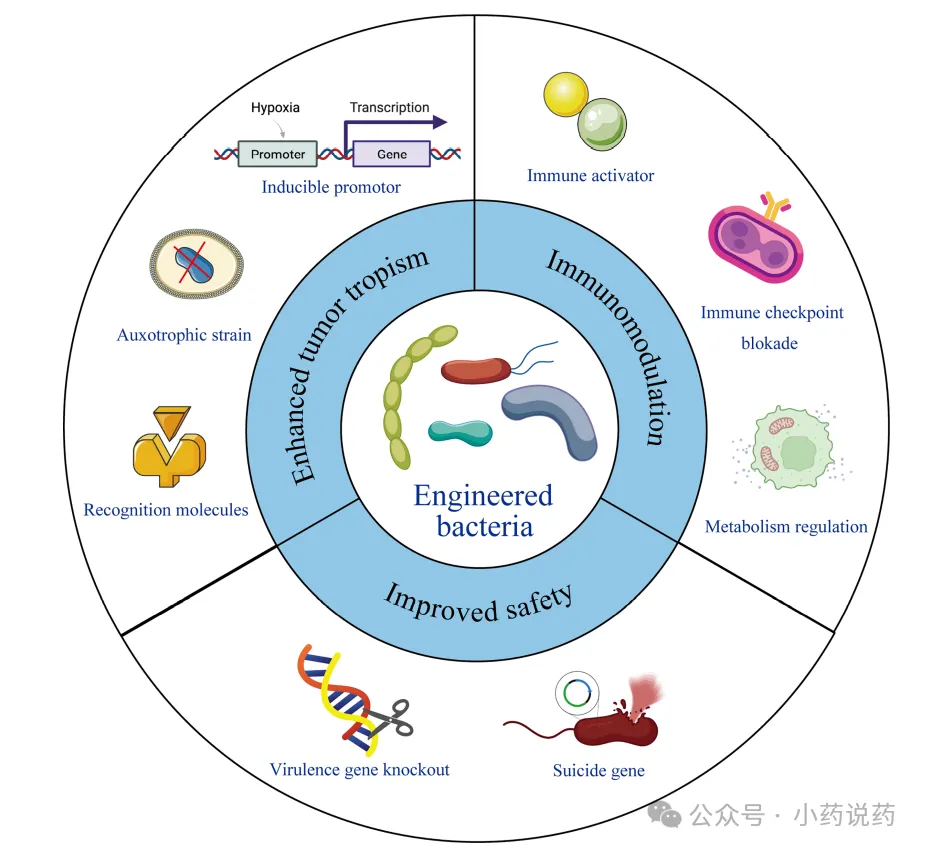 虽然细菌具有良好的抗肿瘤特性,但其潜在毒性是其应用的主要障碍。另一方面,活菌制剂的安全性是其临床转化的关键。为了充分利用细菌对抗癌症,研究人员做出了巨大的努力来构建大量的减毒工程菌,以提高其安全性能。