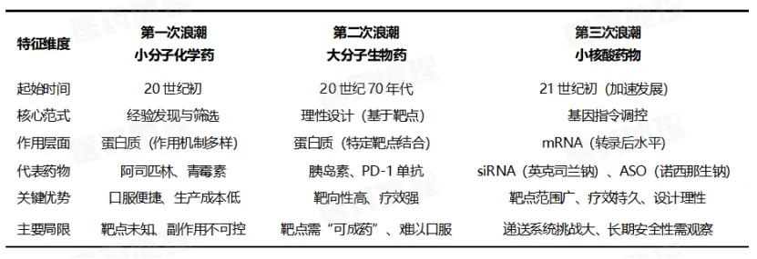 尽管仍面临递送系统等挑战,但小核酸药物正推动治疗范式从“修饰蛋白质”转向“编程基因指令”,有望在未来与小分子药、抗体药形成三足鼎立的新格局。