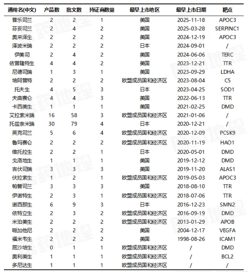 Pharma ONE药物研发大数据平台显示,全球已获批29款小核酸药物(按通用名记,不含疫苗)。其中,普乐司兰与奥来泽生作为针对心血管代谢疾病的“新星”备受关注。普乐司兰是全球首个靶向APOC3的siRNA药物,可将罕见病家族性乳糜微粒血症综合征患者的甘油三酯水平降低达80%,且每年仅需皮下注射4次;奥来泽生作为同样靶向APOC3的ASO药物,旨在治疗更广泛的中重度高甘油三酯血症患者,二者展示了同一靶点下不同技术路径的探索。