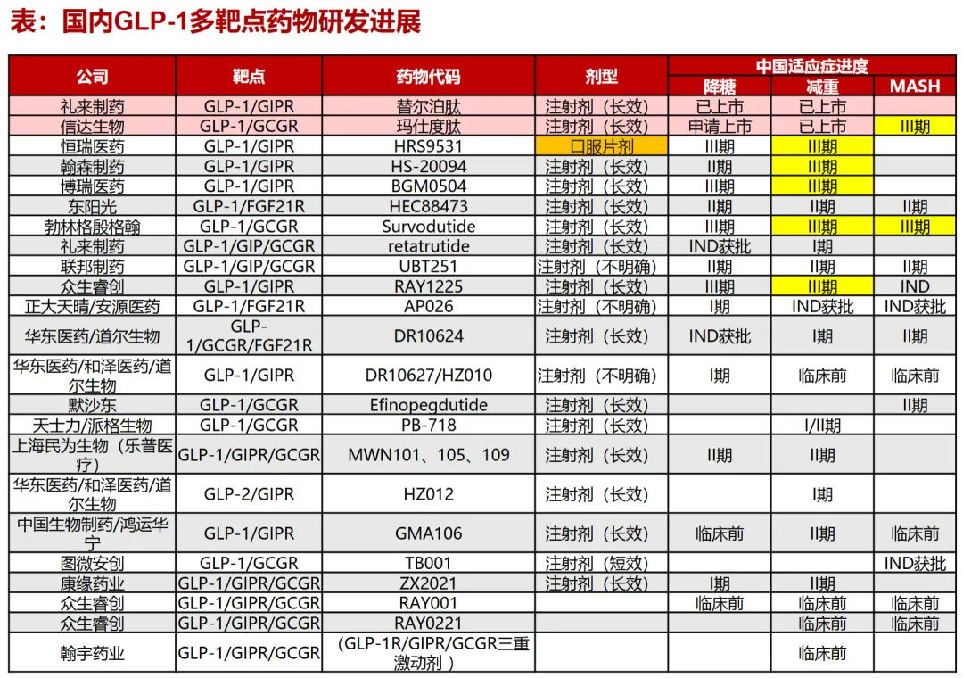 先从国内进度来看,双靶点/多靶点GLP药物中HS-20094算是仅次于礼来替尔泊肽、信达玛仕度肽的第二梯队选手,目前肥胖适应症正处于临床三期,研究已累计给药超一千名受试者,预计将在2026Q1公布数据结果。