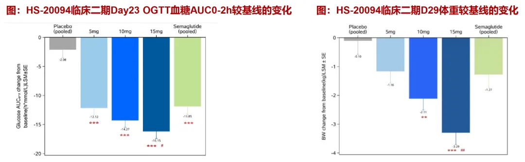 EASD年会上的II期临床研究数据,减重适应症方面,在第4周时HS-20094的15mg组体重较基线的下降4.41%,显著优于司美格鲁肽组(3.29kgvs1.27kg,p=0.0024)。
