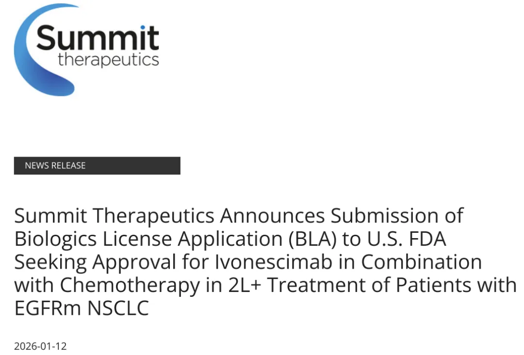 2026年1月12日,Summit Therapeutics宣布已经在2025年四季度向FDA递交PD-1/VEGF双抗Ivonescimab的上市申请,与化疗联合二线及以上治疗EGFR突变非小细胞肺癌患者。
