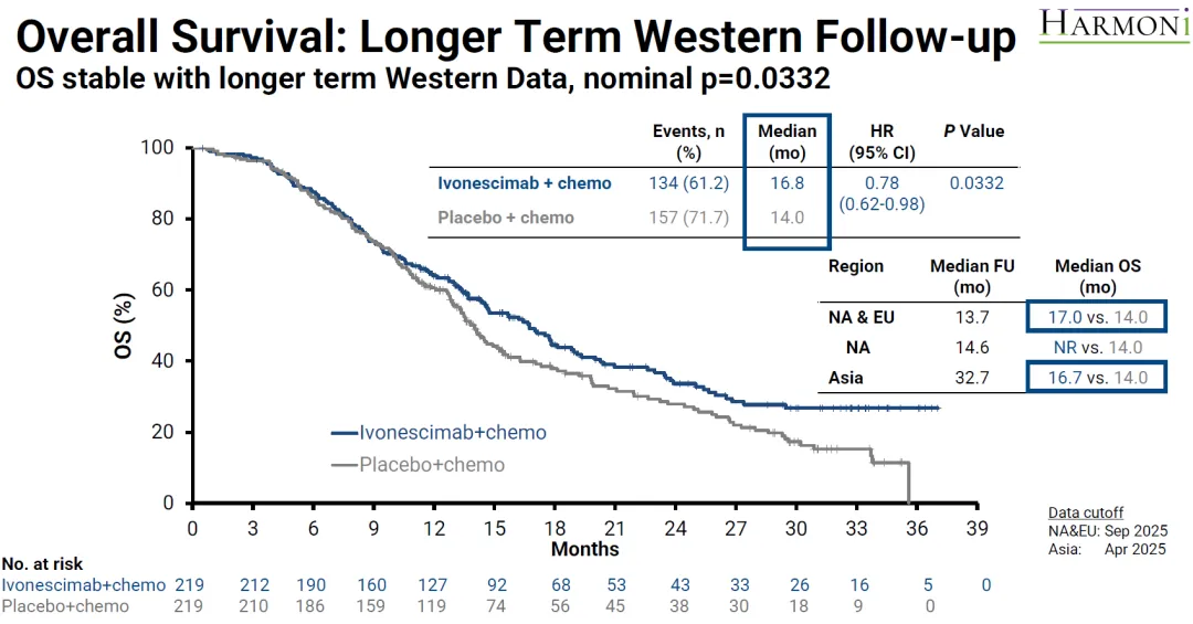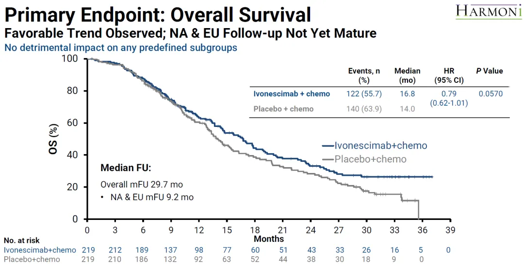 OS未达到统计学显著差异但呈现出改善趋势,最终分析mOS从14.0个月延长到16.8个月,HR=0.79,p=0.057。