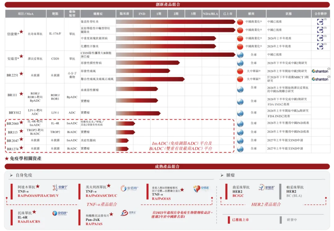 博锐生物致力于为自身免疫类疾病、炎症类疾病、肿瘤免疫类疾病以及免疫系统失调导致的恶性肿瘤类疾病的患者提供全面的免疫治疗方案,已有 7 个商业化上市产品以及 1 个授权商业化推广产品,包括 2 款创新药,分别是 CD20 单抗泽贝妥单抗和 IL-17A/F 抗体比奇珠单抗。
