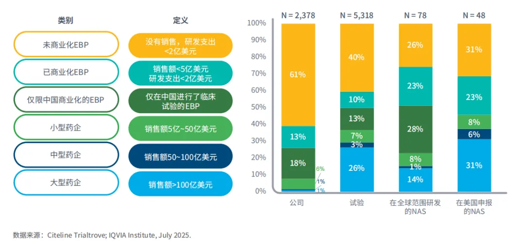 在过去十年中,除仅在中国开展业务的EBP外,拥有临床试验启动记录的公司中有74%为EBP,临床试验中有50%由EBP发起,过去十年NAS的原研方有49%为EBP,向美国FDA提交申请的公司中有54%为EBP。