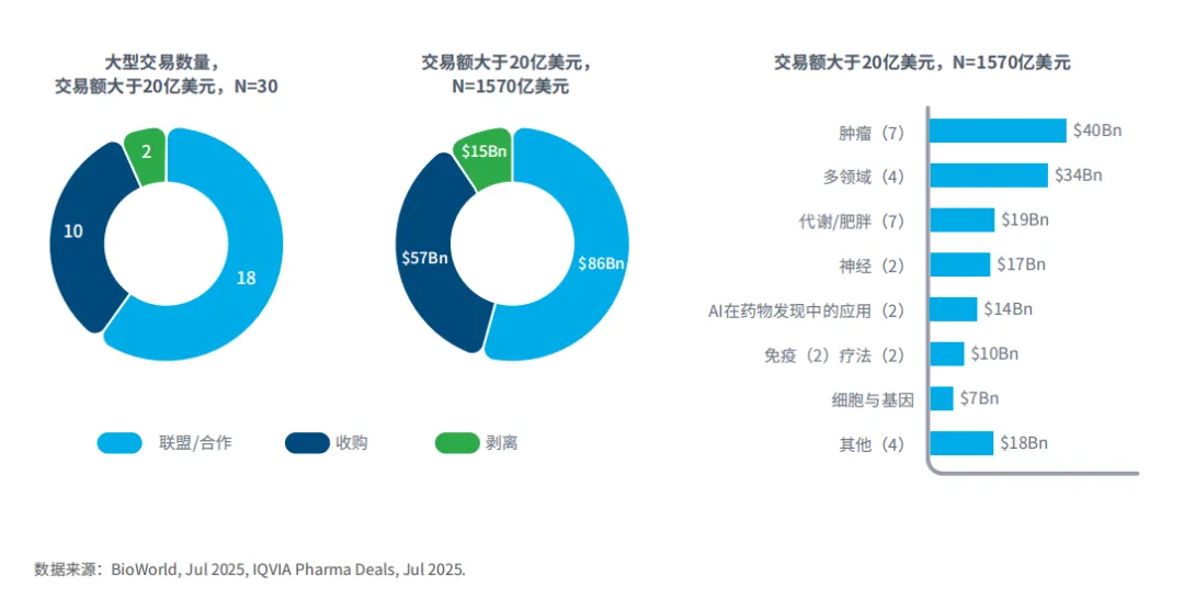 2025年,规模超过20亿美元的大型并购和授权交易数量大幅增加,截至2025年7月已宣布30笔此类交易,超过了2024年全年的数量,预计全年将达到51笔,交易总额预计将达到2690亿美元,远高于2023年和2024年。