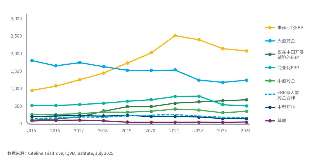2024年,未商业化EBP在各临床研发阶段启动了2090项试验,超过了大型药企(1254项)。