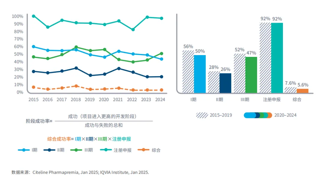 长期趋势显示综合成功率总体呈下降态势,从2015至2019年的7.6%降至2020至2024年的5.6%。