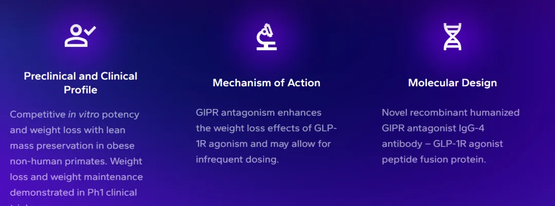ALV-100 是一款双功能葡萄糖依赖性促胰岛素多肽受体(GIPR)拮抗剂 / 胰高血糖素样肽 - 1 受体(GLP-1R)激动剂融合蛋白,旨在实现强效、持久的减重及体重维持效果,同时提升耐受性,针对性解决当前慢性疗法存在的核心局限。(抗体多肽融合,目前正在推进1期临床试验中。