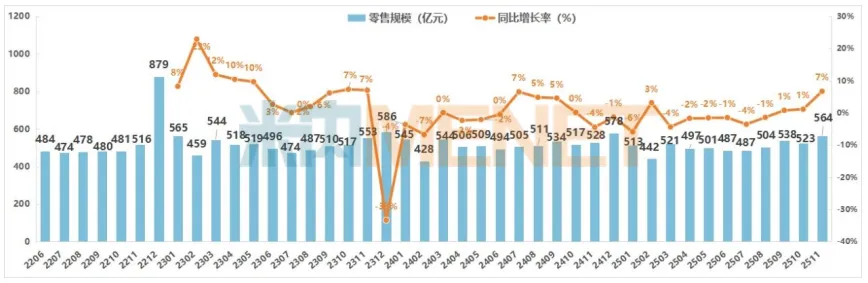 总体分析:2025年11月中国实体药店零售规模(药品+非药)为564亿元,同环比均实现同年最高,市场开始回暖了吗?
