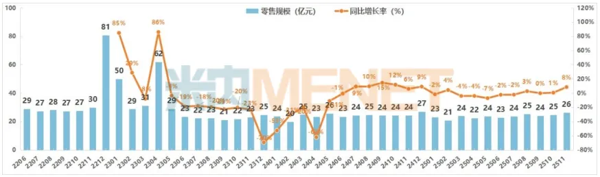 2025年11月全国实体药店医疗器械零售规模为26亿元,较10月上升了7.1%,与去年同期相比,也有8.4%的涨幅。