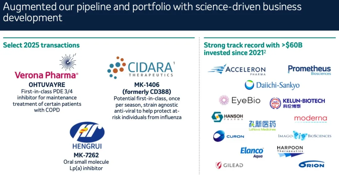 过去5年间,默沙东完成多笔百亿级收购,包括2021年以115亿美元收购罕见病药企Acceleron Pharma、2023年以108亿美元收购免疫领域企业Prometheus Biosciences、2025年以100亿美元收购专注于呼吸系统疾病药物开发的Verona Pharma,以及近期92亿美元收购了抗感染药物开发商Cidara Therapeutics。