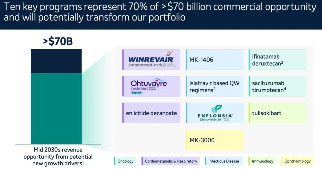 这一预期主要基于10个关键项目,它们构成了这700亿美元的70%。这些项目均具有成为重磅炸弹的潜力,被默沙东视为价值数十亿美元的产品。其中4个项目已经上市或取得积极的III期临床结果,其余项目将在未来12至18个月内公布重要的Ⅲ期数据。
