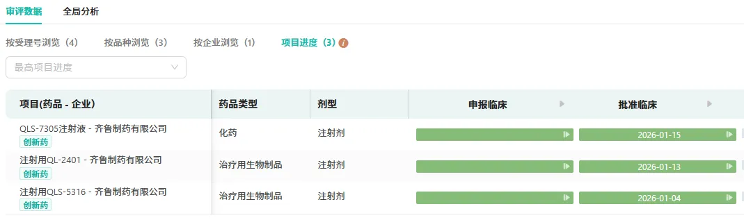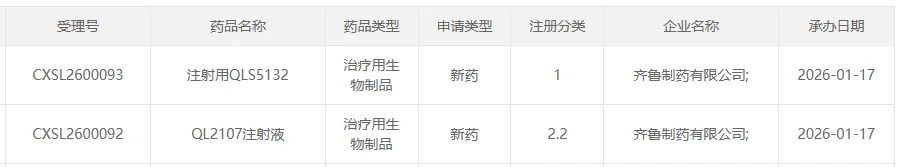 1月17日,CDE官网公示,齐鲁制药的1类创新药注射用QLS5132与2.2类新药QL2107注射液临床申请同步获受理。此次“双弹齐发”,刷新了其生物药管线的推进节奏。