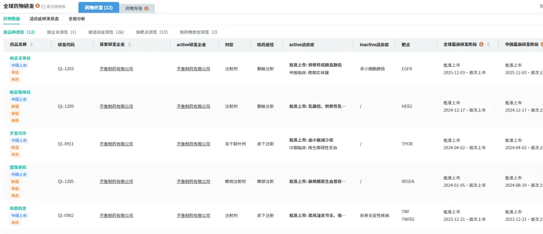 生物药是齐鲁制药重点布局的药品类型之一。摩熵医药数据库的数据显示,2025年,齐鲁制药共有11款1类新药首次在国内获批临床,其中6款为生物药。这些新药的适应症高度集中在抗肿瘤领域,涵盖了ADC、双抗、单抗等多个热门研发方向。