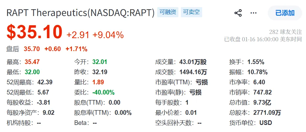2026年1月20日,GSK宣布22亿美元收购RAPT Therapeutics。根据协议,GSK将以每股58美元现金收购RAPT 全部流通股,股权总价值约22亿美元。扣除标的公司现金后,GSK前期投资额为19亿美元。受此消息影响,RAPT股价涨超9%,报35.10美元/股。