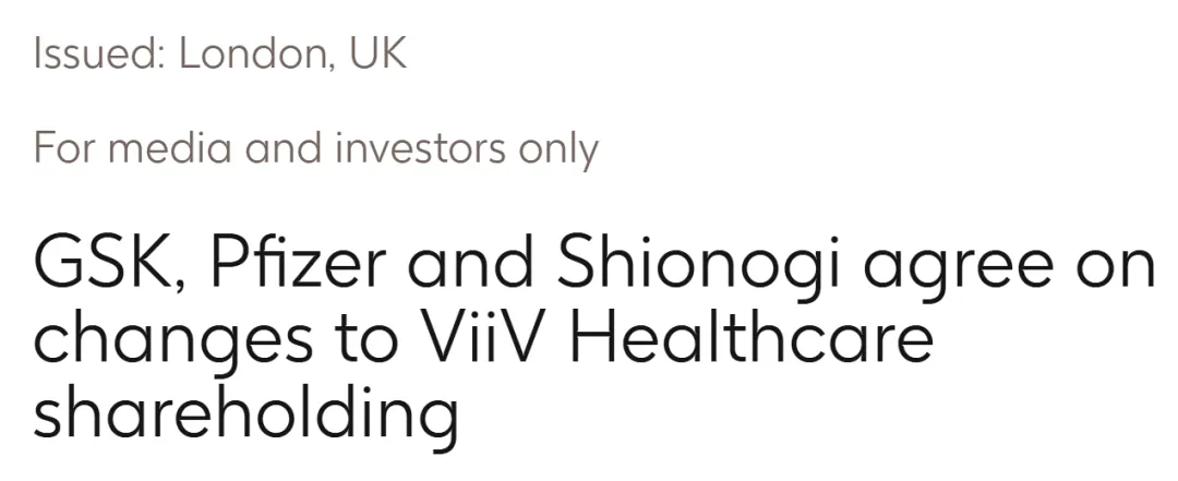 2026年1月20日,GSK与盐野义制药共同宣布,已与辉瑞达成协议,盐野义将接替辉瑞持有ViiV Healthcare 11.7%的股权。交易完成后,盐野义在ViiV的股权比例提升至21.7%,GSK则继续保持78.3%的控股地位。