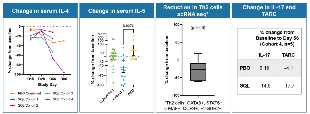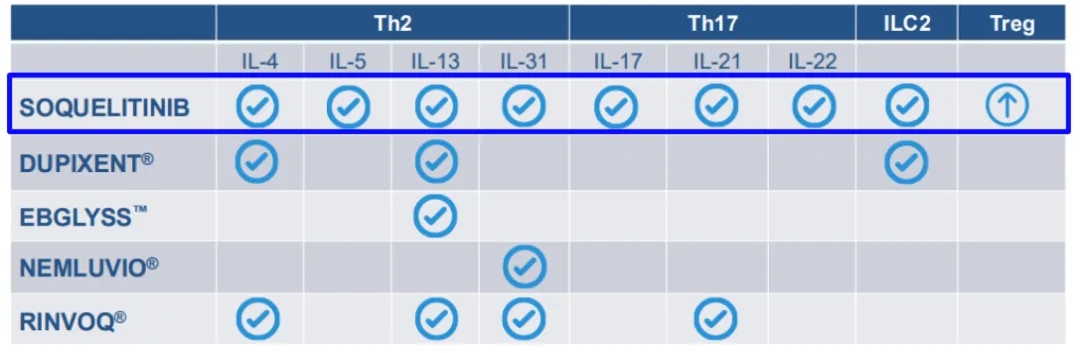 我们可以从下图中,血清IL-4、IL-5、IL-17、TARC的变化及Th2细胞的减少等生物标志物数据看到ITK抑制剂SQL可调节多条免疫通路泛抑制作用,这样带来的好处是:相比大部分已经获批的抑制免疫通路较为单一的药物(IL-4/IL-13、JAK等抑制剂),SQL对AD各分型的治疗覆盖可能更广,并且对于一些异质性较强的患者群体可能的治疗潜力更大;不过,也需要重视泛抑制带来的安全性问题(如乌帕替尼的黑框安全性警告)。