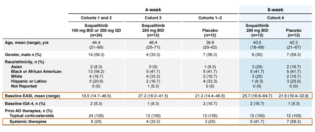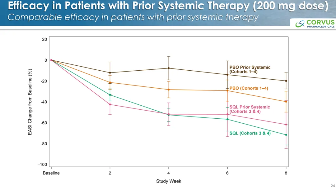 从患者基线设计上来看,Corvus的临床设计有几个可圈可点之处:1)治疗人群多样化,包括基线EASI评分范围大(队列4:16.6-64.7),同时非裔美国患者占比较高(可能意味着SQL患者群体治疗难度更大);2)在队列4中,分别在治疗组和安慰剂入组了5名(41.7%)、7名(58.3%)接受全身治疗的患者,其中包括Dupi和乌帕替尼;3)而在队列3-4中,可以明显看到安慰剂组患者的EASI基线评分较治疗组更低(安慰剂组EASI基线评分更低可能提示更高的安慰剂效应,不容易做出差异)。