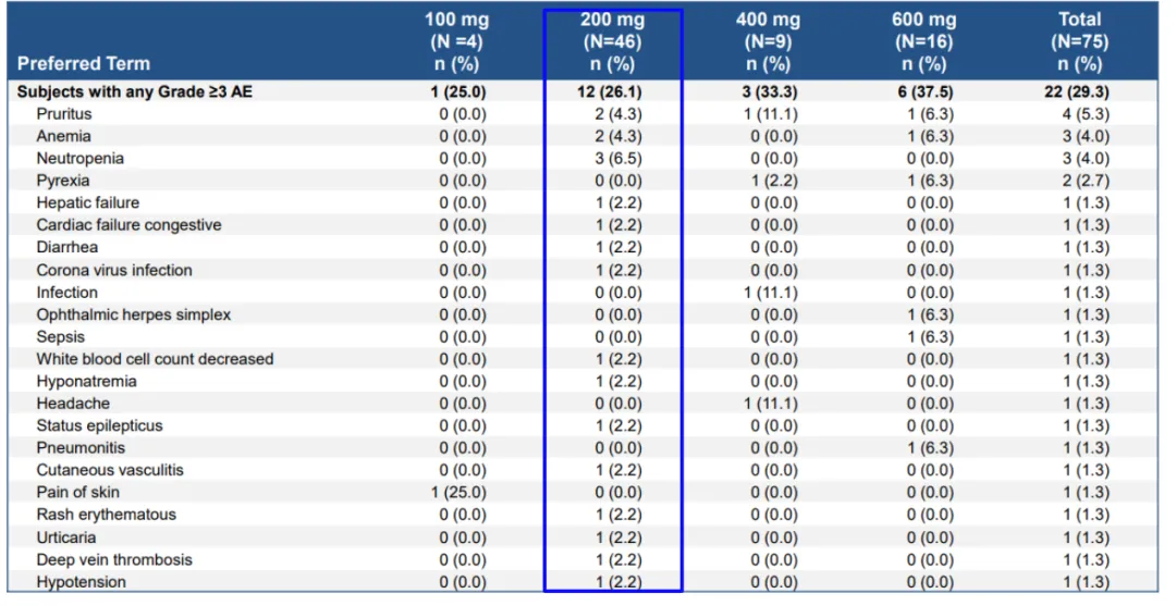 其中人数最多的200mg BID治疗组中,26.1%患者出现≥3级不良事件,其中有1例肝衰竭(过往有CCR4拮抗剂出现过肝毒性而失败),但尚不清楚与治疗是否相关。不过,值得注意的是在该试验中有多名患者长期用药1-2年,一定程度为AD患者长期使用SQL治疗提供支撑。