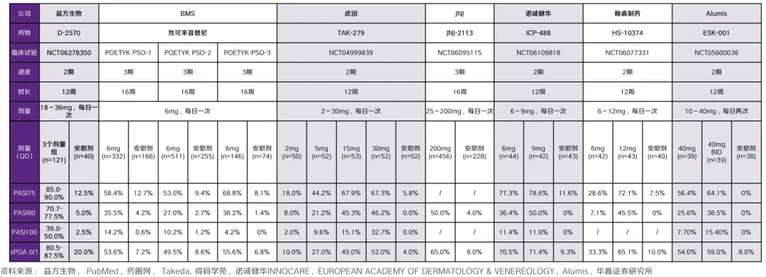 当然,一众TYK2抑制剂也是在AD领域有力的竞争者,其中目前表观最出色的无疑是益方生物的D-2570,在12周时可达到经安慰剂调整后最高77.5%额EASI75应答率;不过这一结果是中国临床结果(亚洲人群),同时公司未明确披露临床基线(生物制剂经治比例),不太好与KT-621和SQL直接比较。