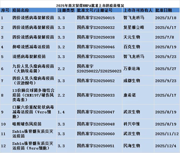 2025年,国家药品监督管理局(NMPA)的审评审批工作在“数量增长”的同时,更呈现出“结构优化”的特征。在获批的12款疫苗中,流感疫苗以42%的占比成为绝对主力,这与当年全国流感疫情处于中高流行水平的防控形势直接相关。智飞龙科马、武汉生物各自有2款疫苗获批,在数量上处于行业前列。