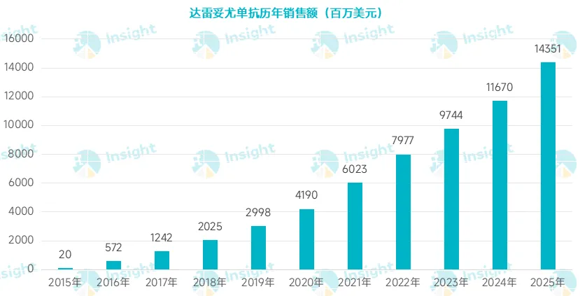随着新适应症的拓展、皮下制剂的成功开发、获批地区的增加,达雷妥尤单抗销售额也一路狂飙。2024 年,其在上市 9 年后年销售额首次突破 100 亿美元(116.7 亿美元),跻身超级重磅炸弹之列。2025 年,达雷妥尤单抗继续保持 23.0% 的强劲增长,创收 143.51 亿美元,靠一己之力撑起了强生肿瘤业务的半边天。