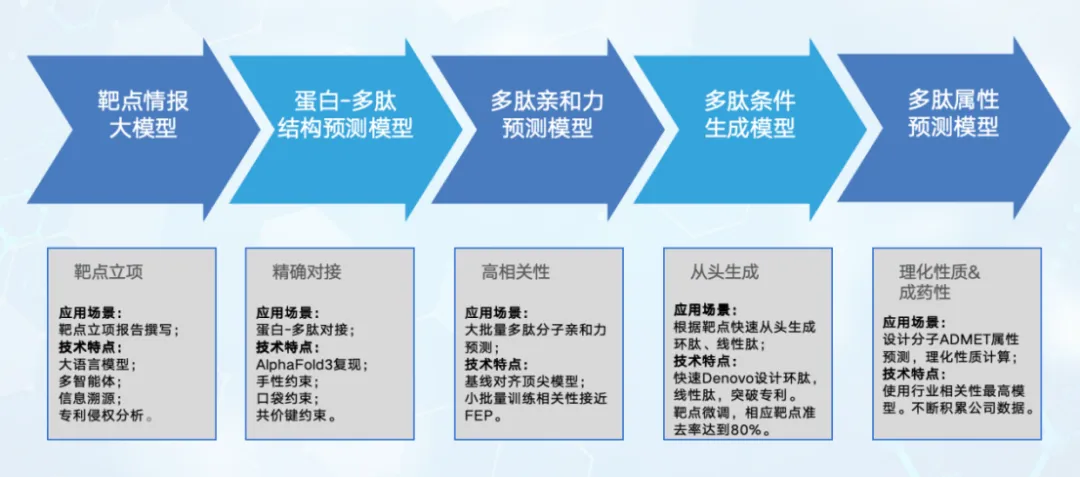 通过历时近10个月的搭建、测试,阳光诺和AI多肽制药大模型多个模块已经投入运行,包括“靶点情报大模型”、“蛋白-多肽结构预测模型”、“多肽亲和力预测模型”、“多肽条件生成模型”、“多肽属性预测模型”。