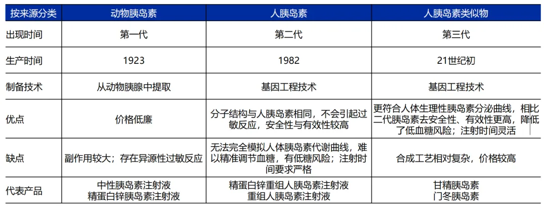目前临床上的胰岛素,按技术水平,可分为动物胰岛素(第一代,基本被淘汰)、人胰岛素(第二代)、人胰岛素类似物(第三代)。