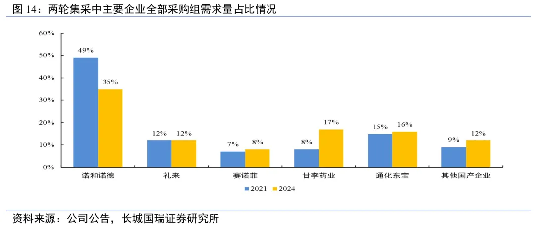 甘李药业市场份额由约 8% 快速提升至 17%,通化东宝及其他国产企业也实现不同程度增长;相对应地,外资企业份额整体收缩,诺和诺德由 49% 降至 35%,礼来和赛诺菲基本持平,国产替代节奏明显加快。