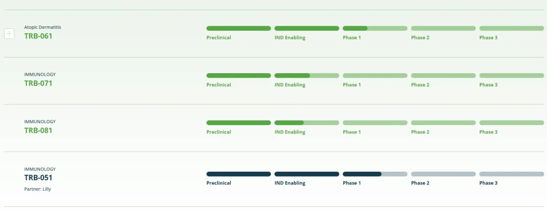 TRB-061旨在通过优先扩大与免疫调节最相关的组织许可Tregs亚群来减少炎症并促进屏障组织修复。TRB-061激动TNFR2,TNFR2是优先位于疾病相关组织中的效应Tregs的关键激活剂,旨在精确模拟天然TNF配体。TRB-061对TNFR2的选择性激动可能代表了长期炎症性疾病控制的新治疗支柱。TRB-061目前正在临床开发中,用于治疗中重度特应性皮炎。