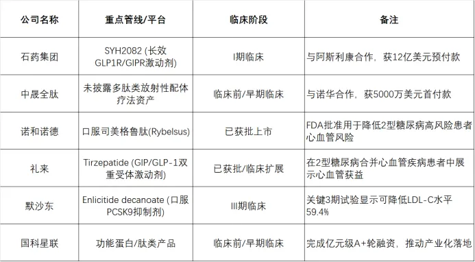 全球多肽药物研发呈现多元化格局,既有大型跨国药企持续投入,也有创新生物技术公司不断涌现。