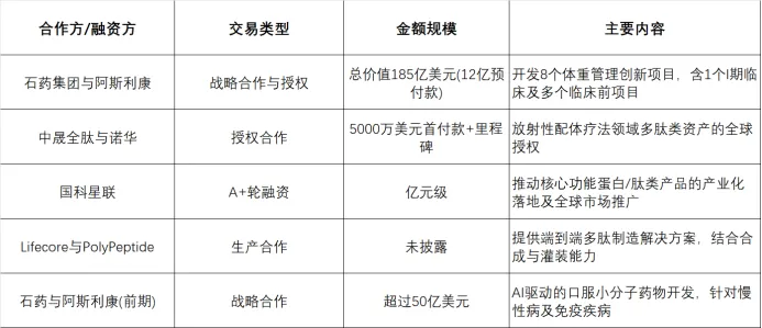 多肽药物领域近期发生了多起重大合作与融资事件,反映了资本和市场对这一领域的高度关注。