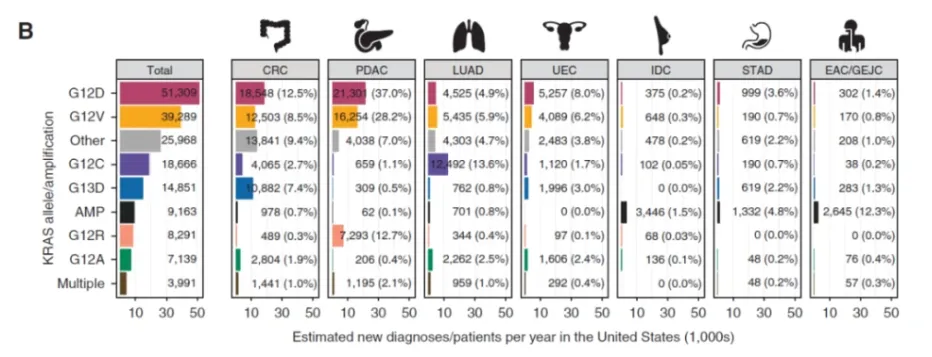作为人类癌症发展进程中极为常见的驱动因素,全球范围内约30%的人类肿瘤与RAS基因突变相关。其中,约30%-50%的结直肠癌患者、15%-20%的非小细胞肺癌患者以及90%的胰腺癌患者存在KRAS突变阳性情况。